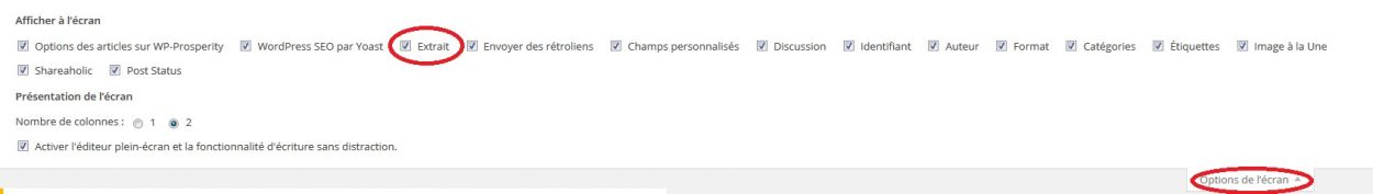 Si la fenêtre « extrait » ne s’affiche pas, il faut cliquer sur « Options de l’écran » (tout en haut à droite de votre écran) et cocher la case « extrait ».